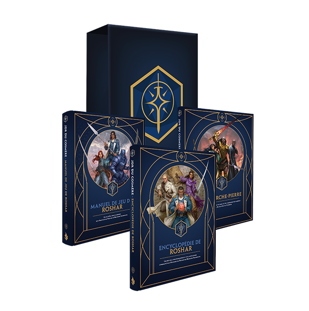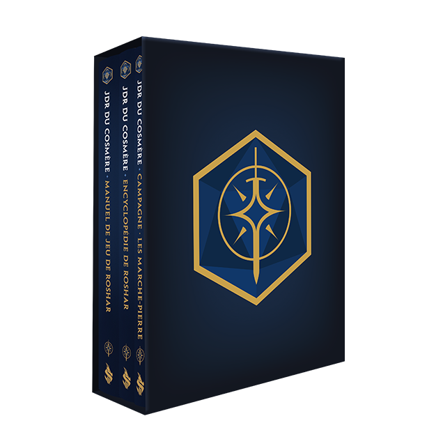 Ce coffret luxueux rassemble les trois livres principaux pour partir à l’aventure et explorer l’univers de Roshar dans le jeu de rôle du Cosmère.