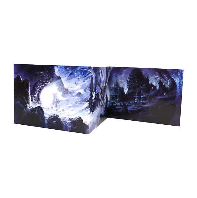 - L’Ecran du meneur : cet écran rigide en trois volets représente la lutte épique d’un dragon blanc et d’un dragon d’argent dans des ruines antiques dominées par un portail ateak