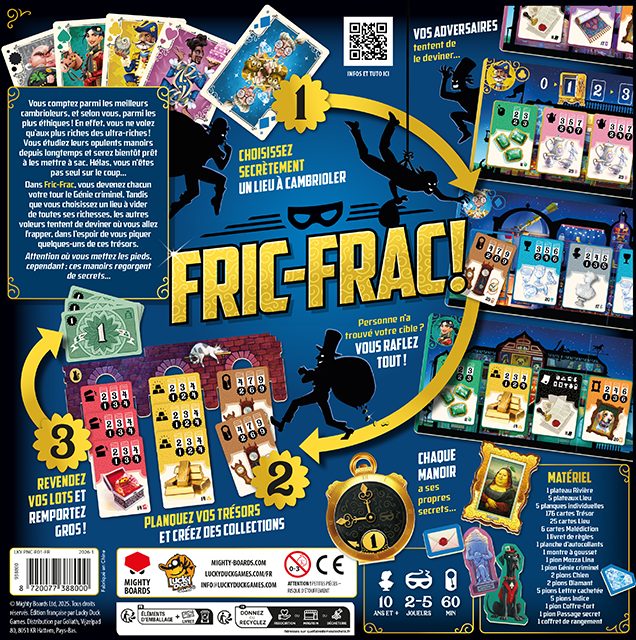 Dans Fric-Frac!, vous devenez chacun votre tour le Génie criminel. Tandis que vous choisissez un lieu à vider de toutes ses richesses, les autres voleurs tentent de deviner où vous allez frapper, dans l’espoir de vous piquer quelques-uns de ces trésors.