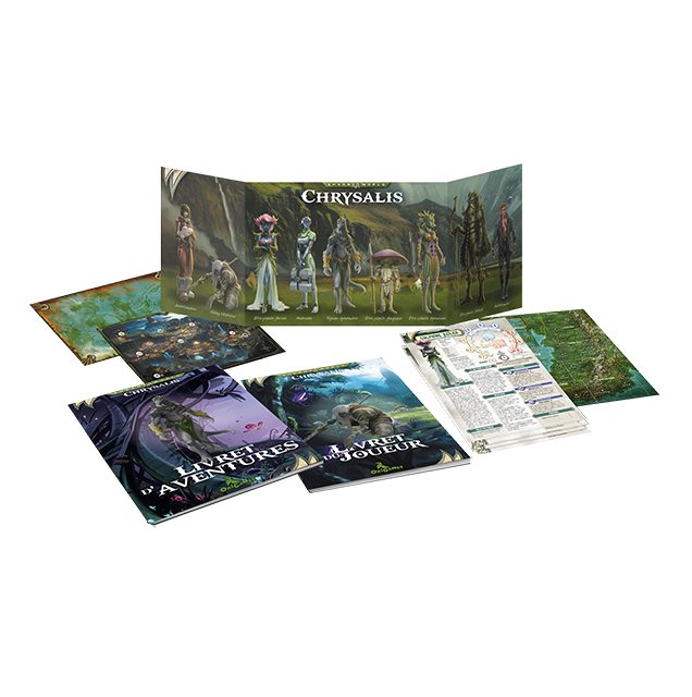 Une boîte cartonnée contenant l’essentiel pour faire ses premiers pas dans Chrysalis, au travers de 3 scénarios évolutifs, jouables en solo ou à plusieurs, avec ou sans MJ, et sans préparation. Elle contient un livret du joueur, un livret d’aventures, un écran souple, 5 personnages prétirés, et des aides de jeu.