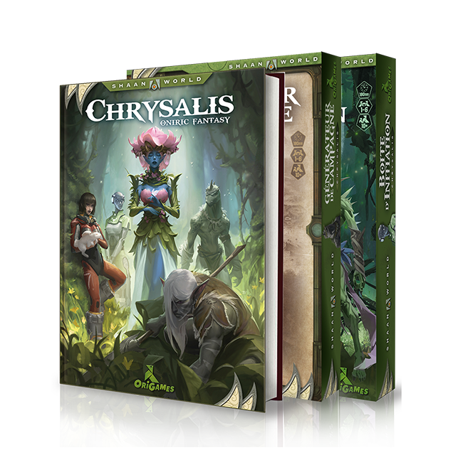 Ce pack contient le Livre-jeu Chrysalis + la Boîte d’initiation + le coffret de Générateur de campagne + un Poster Chrysalis/Relhosoï + une aide de jeu au format A4 + le livret des Lignées héossiennes.