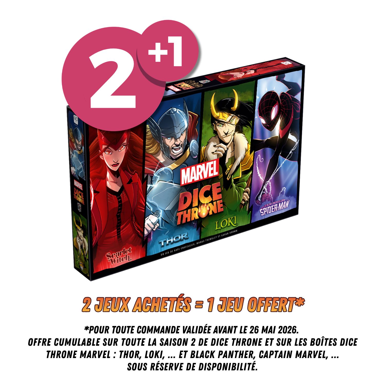 Dans Marvel Dice Throne , vous devenez l’un des huit héros les plus célèbres de Marvel, dont Black Panther, Captain Marvel, Black Widow, Scarlet Witch, Loki, Thor, Doctor Strange et Miles Morales Spider-man ! Chaque héros de Marvel Dice Throne a été minutieusement conçu et équilibré pour offrir l’expérience la plus thématique possible, vous permettant d’incarner vos héros préférés comme dans nul autre jeu. Avec de nouveaux mécanismes et des designs asymétriques, ces héros sont les plus innovants et les plus excitants à ce jour !