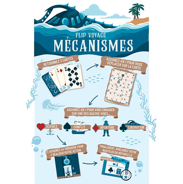 Dans le jeu, chaque joueur incarne un personnage de l’équipage et prend les commandes d’une réplique rudimentaire du Nautilus, explorant les océans, gagnant des récompenses et affrontant des dangers. Chaque tour, vous retournez trois cartes, assignez une d’elles à votre déplacement, une autre à une discipline particulière (science, conflit, sauvetage, libération) et une dernière à une action de la discipline choisie.