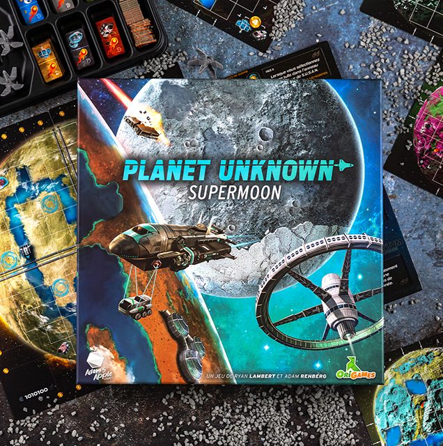 Supermoon est une extension du jeu Planet Unknown composée de 3 modules combinables ainsi que de nouvelles cartes à rajouter à vos parties. Le 1er module vous propose de terraformer une Lune sur laquelle vos tuiles pourront être placées au lieu de l’être sur votre Planète. Le Satellite en orbite autour pourra détruire toutes les Météorites dans sa ligne de mire. Le 2e module apporte de nouvelles tuiles et le 3e de nouveaux blocs terrains !