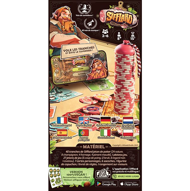 - Application : Application compagnon Sifflard gratuite requise, multilingue, jouable hors ligne, disponible sur iOS et Android.